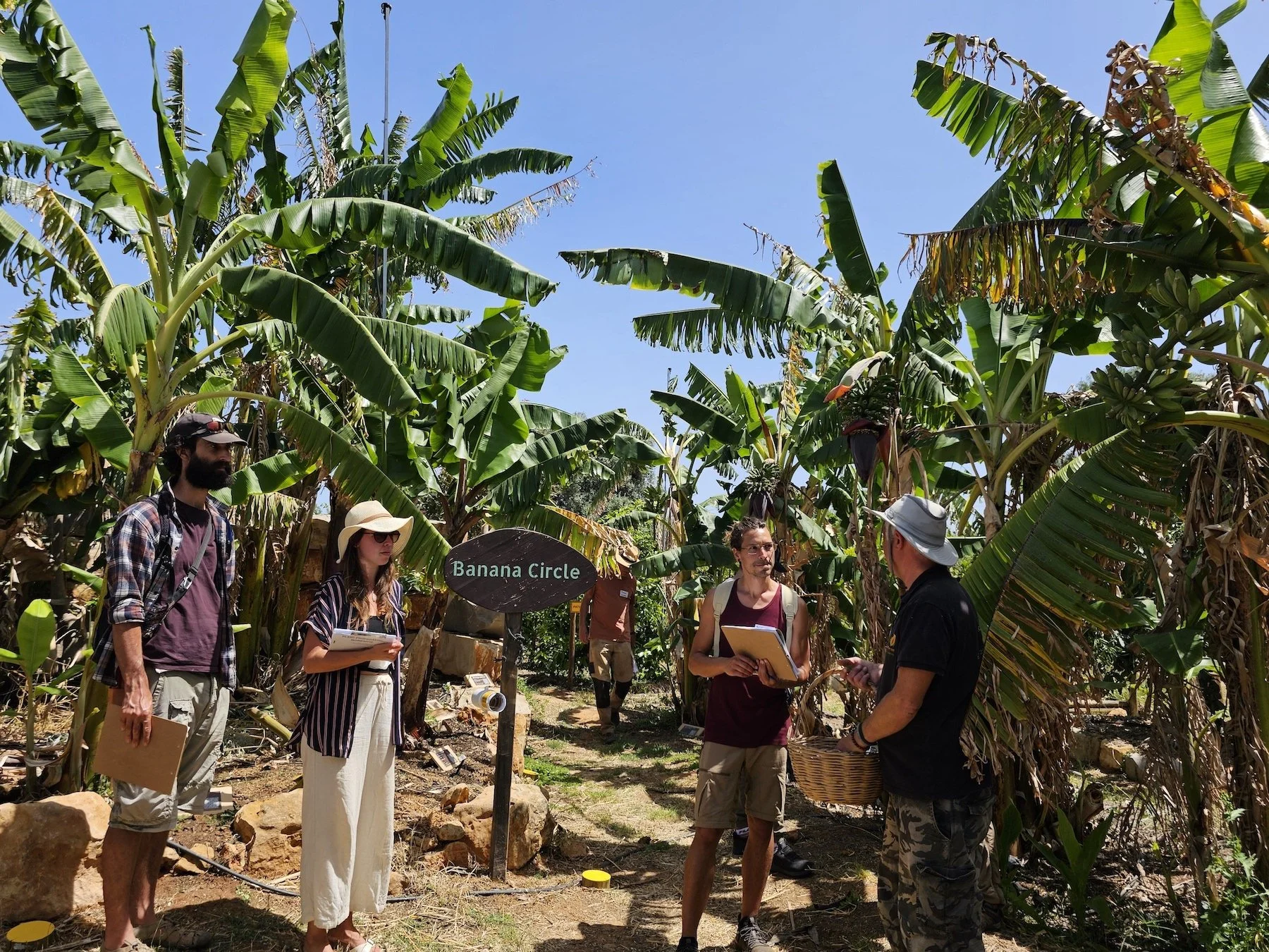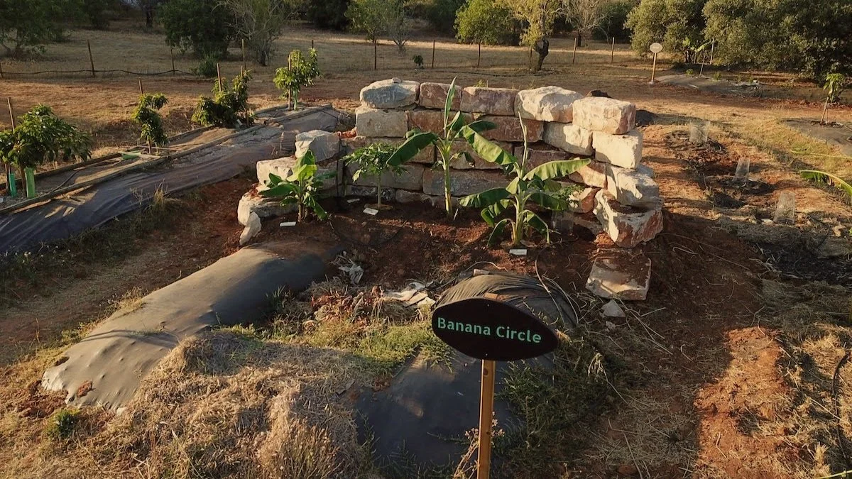 In order to improve the banana circle design, we recommend you to build a stone wall on the Northern edge of your banana circle in order to offer some wind protection and to create a big thermal mass which will protect the plant during the colder months. We also recommend planting the papayas against that wall because they are very sensitive.