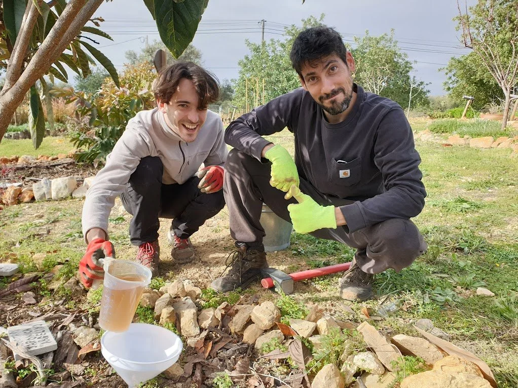 Happy WWOOFers Jules PERCHER and Miguel PEREIRA, inoculating a Eriobotrya Japonica with a mycorrhizal fungi biostimulant.