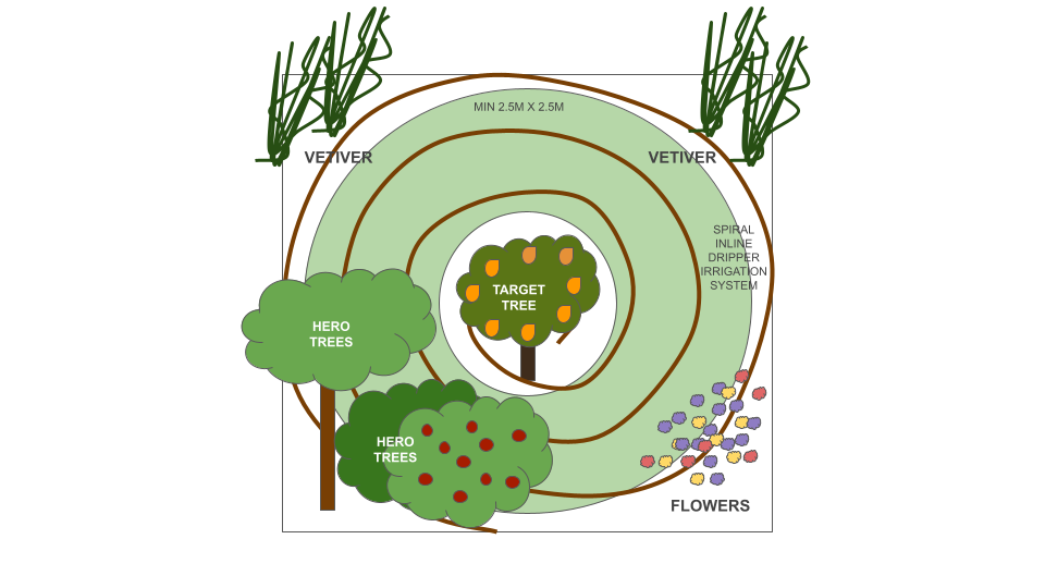 Not planted randomly: the idea is to create a “forest environment” around each fruit tree. All target trees are planted in the middle of a minimum area of 6 m² and are surrounded by “helping” plants: a mulch generating plant, selected flowers for pollination and predators, fast growing “hero trees”.