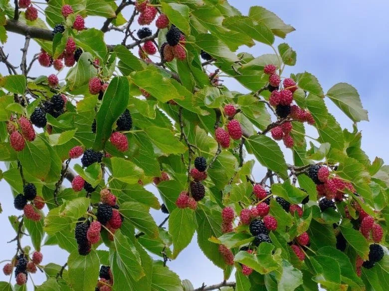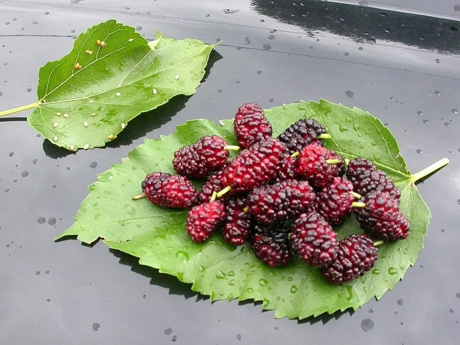 The edible fruit is dark purple, almost black, when ripe, 2–3 centimetres (0.8–1.2 in) long, a compound cluster of several small drupes; it is richly flavoured, similar to the red mulberry (Morus rubra) but unlike the more insipid fruit of the white mulberry (Morus alba). Much longer period of fruiting, and even after just a year !