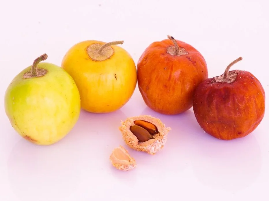 The fruit is eaten raw or preserved. A sourish to sweet flavour, depending on the variety. The fruit can be made into a floury meal, butter, or a cheese-like paste, used as a condiment. The yellow-orange to brown fruit turns black at maturity. The seeds have a sweet flavour, they are eaten as a snack. Young leaves can be cooked as a vegetable.