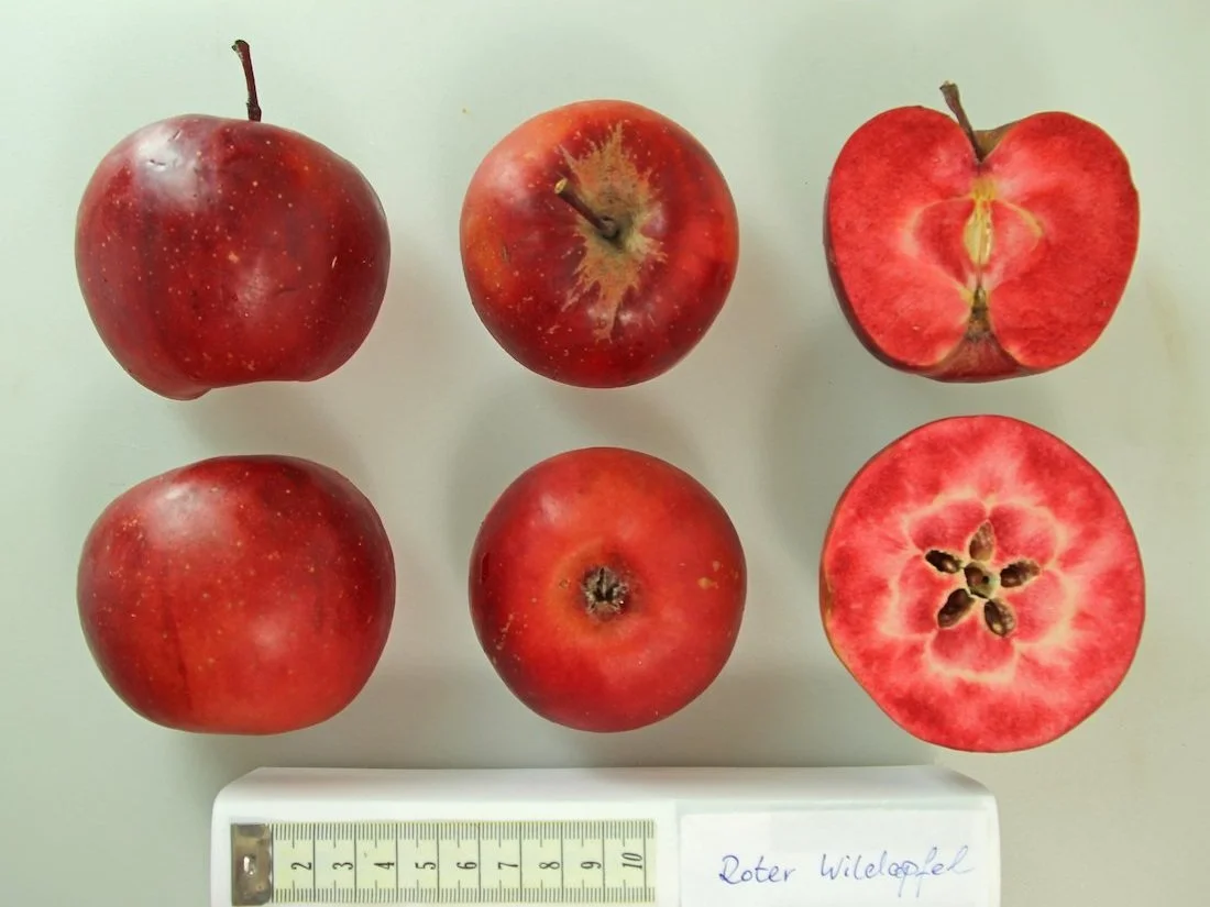 Almata / Red Flesh apple: Yellow-red skin-red flesh apple, sour but juicy-extremely suitable for kitchen preparations and with color retention in cooking preparations. Almata has proven quite popular because of its apparent health benefits - the anthocyanin pigments which give the apple its distinctive dark red appeance are rich in anti-oxidants.