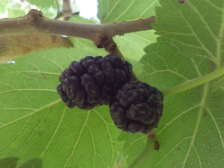 The edible fruit is dark purple, almost black, when ripe, 2–3 centimetres (0.8–1.2 in) long, a compound cluster of several small drupes; it is richly flavoured, similar to the red mulberry (Morus rubra) but unlike the more insipid fruit of the white mulberry (Morus alba).