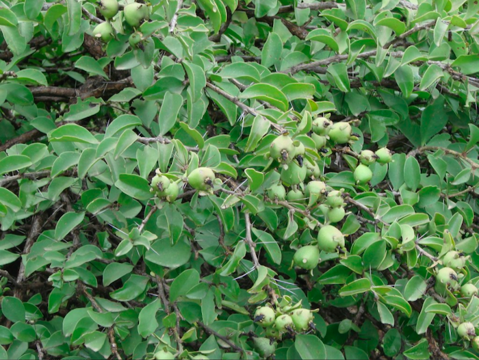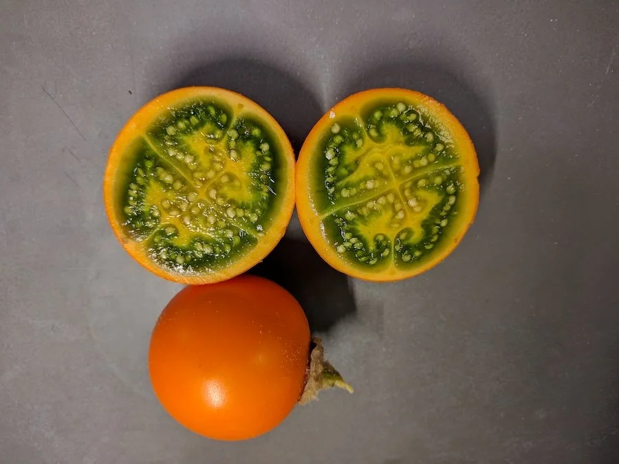 The small edible fruits are red on the outside and yellow inside. It grows inside a spiny, green husk. The fruit is ripe when it is easily removed from the stem. The flavor resembles sour cherries and a little bit like a tomato.
