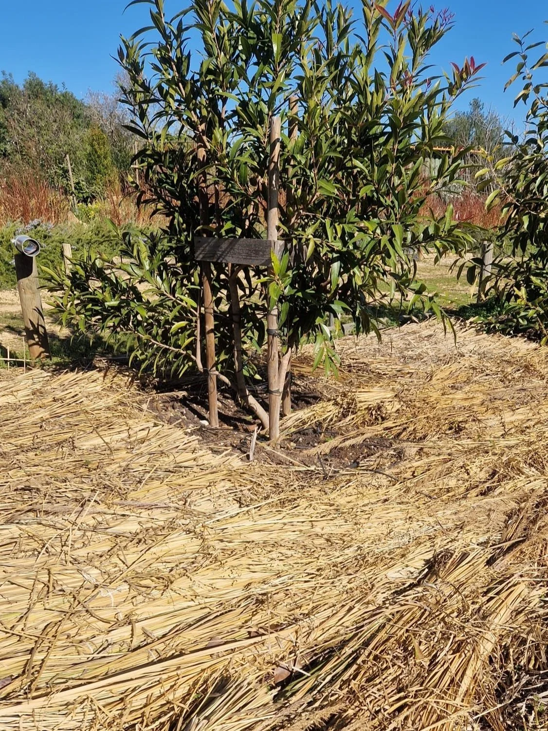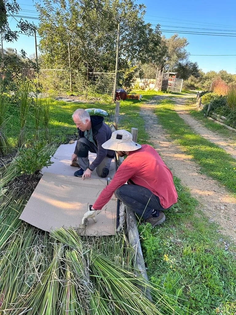 Collect each bunch and position on the ground, around your trees or on your garden beds. The objective is to create a dense thick “carpet”. An extra protection against weeds can be a layer or two of cardboard mulch, made wet and laid down before setting the vetiver grass on top.