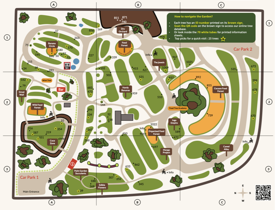 Prepare your trip to the Orchard of Flavours Botanical Garden by checking the names and locations of 70 food trees which you shouldn’t miss! For each individual tree, we provide their unique ID number and quadrant of the map where to find it.